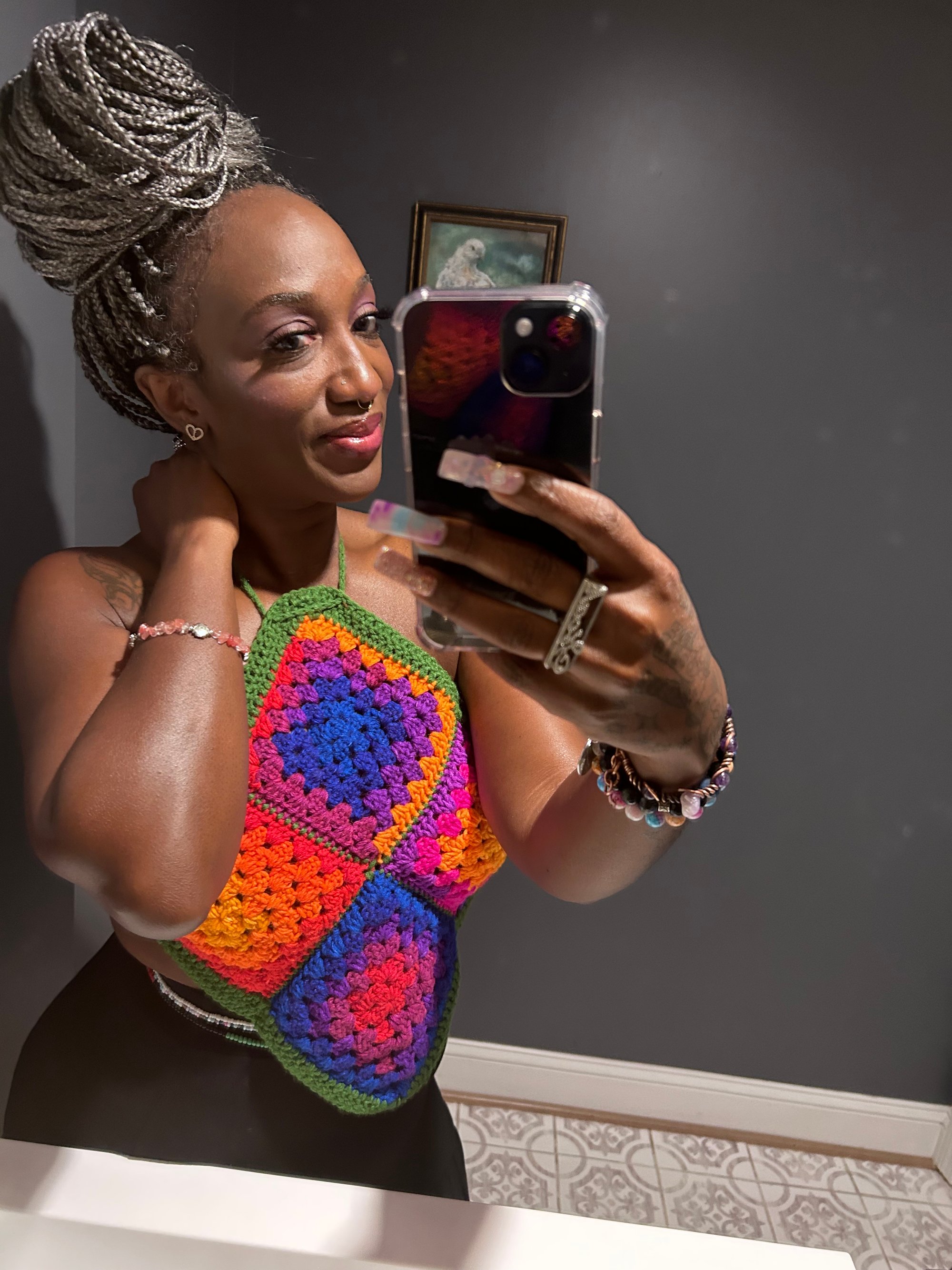 This is an item of clothing. It is crocheted with a lightweight, 100% acrylic yarn. Perfect for wearing on a particular occasion, or during any season! Made in the U.S. Size M.